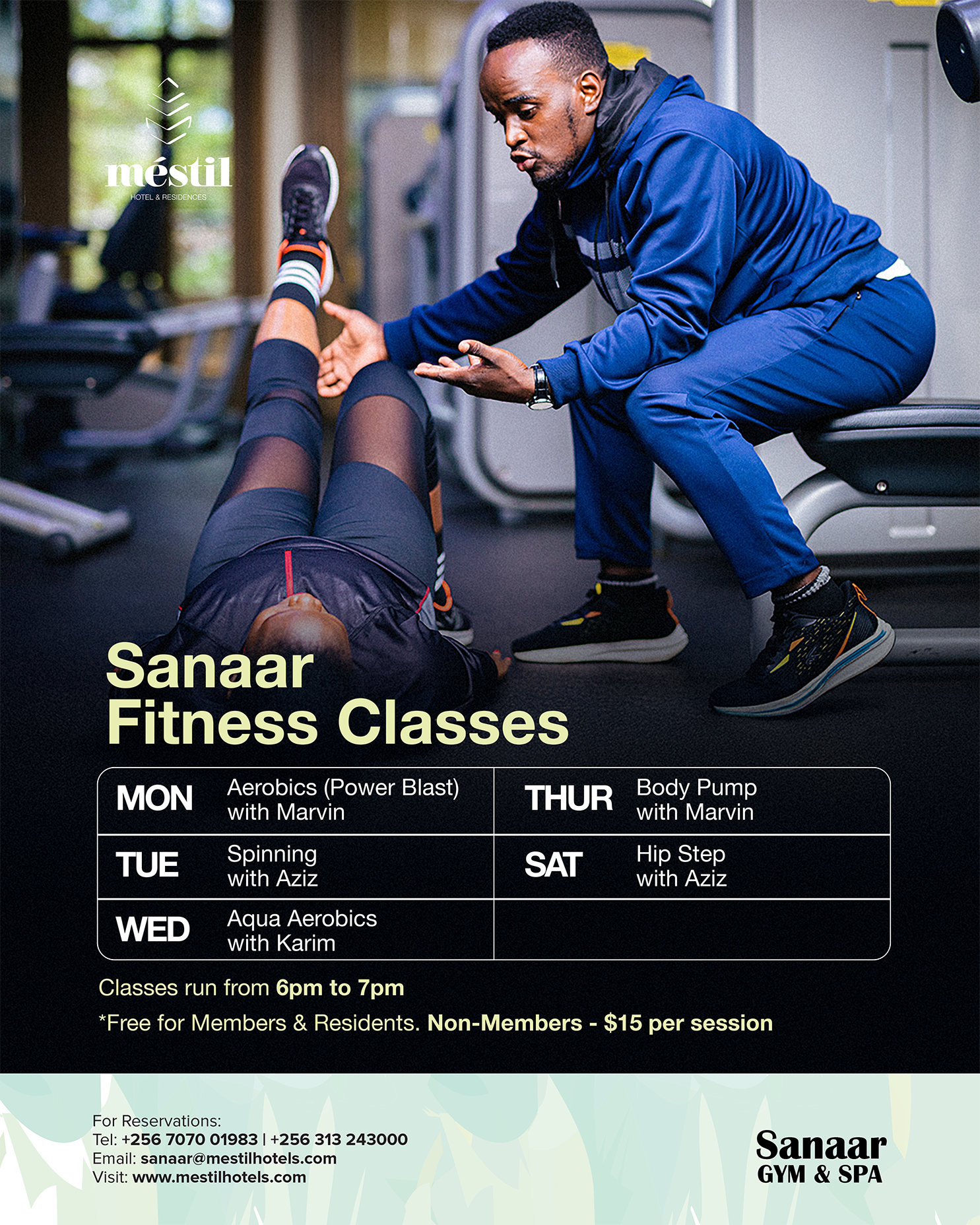 Join our evening fitness sessions from 6–7 PM (Monday to Thursday & Saturday). Rejuvenate your body and mind at Sanaar Gym & Spa.